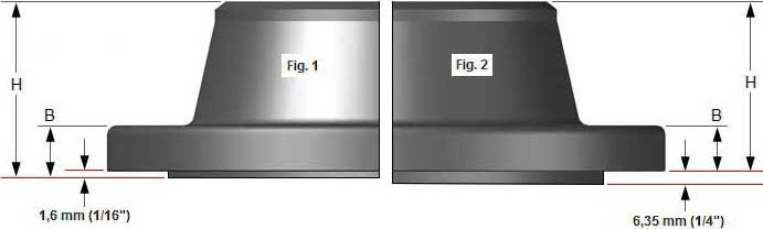 在CLASS400, 600, 900, 1500和2500压力等级,突面的高度约为6.4mm(1/4 inch)。在这些压力等级中,对多数的法兰供应商而言,法兰总高度H和法兰凸缘厚度B不包括密封面的厚度。