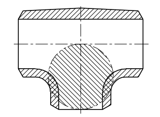 BS EN10253.2 规定,仅三通的侧壁部位需要进行NDT检测,该区域为一圆形,包括了从支管端部到主管中心线的区域。如果尺寸允许,三通内壁和外壁均应进行NDT检测。参见下图,圆形区域即为检测区域。