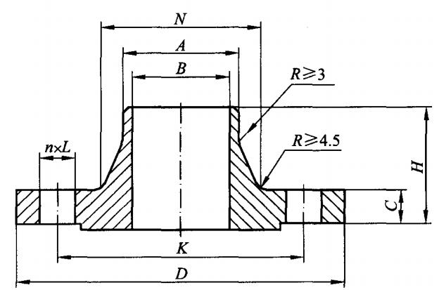 | DN | NPS | 钢管外径, A | 法兰外径,D | 螺栓孔中心圆直径,K | 螺栓孔直径,L | 螺栓规格 | 螺栓孔数 | 密封面直径 | 密封面高度 | 法兰内径,B | 法兰颈部直径,N | 法兰厚度,C | 法兰高度,H |
