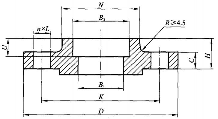 | DN | NPS | 钢管外径, A | 法兰外径,D | 螺栓孔中心圆直径,K | 螺栓孔直径,L | 螺栓规格 | 螺栓孔数 | 密封面直径 | 密封面高度 | 法兰厚度,C | 法兰内径,B1 | 承插孔直径,B2 | 承插孔深度,U | 法兰颈大端,N | 法兰高度,H |