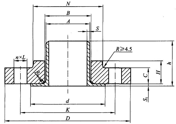 | 公称尺寸 | 钢管外径,A | 连接尺寸 | 法兰内径,B | 颈部直径,N | 法兰厚度,C | 法兰高度,H | 圆角,R1 | 对焊环 | ||||||