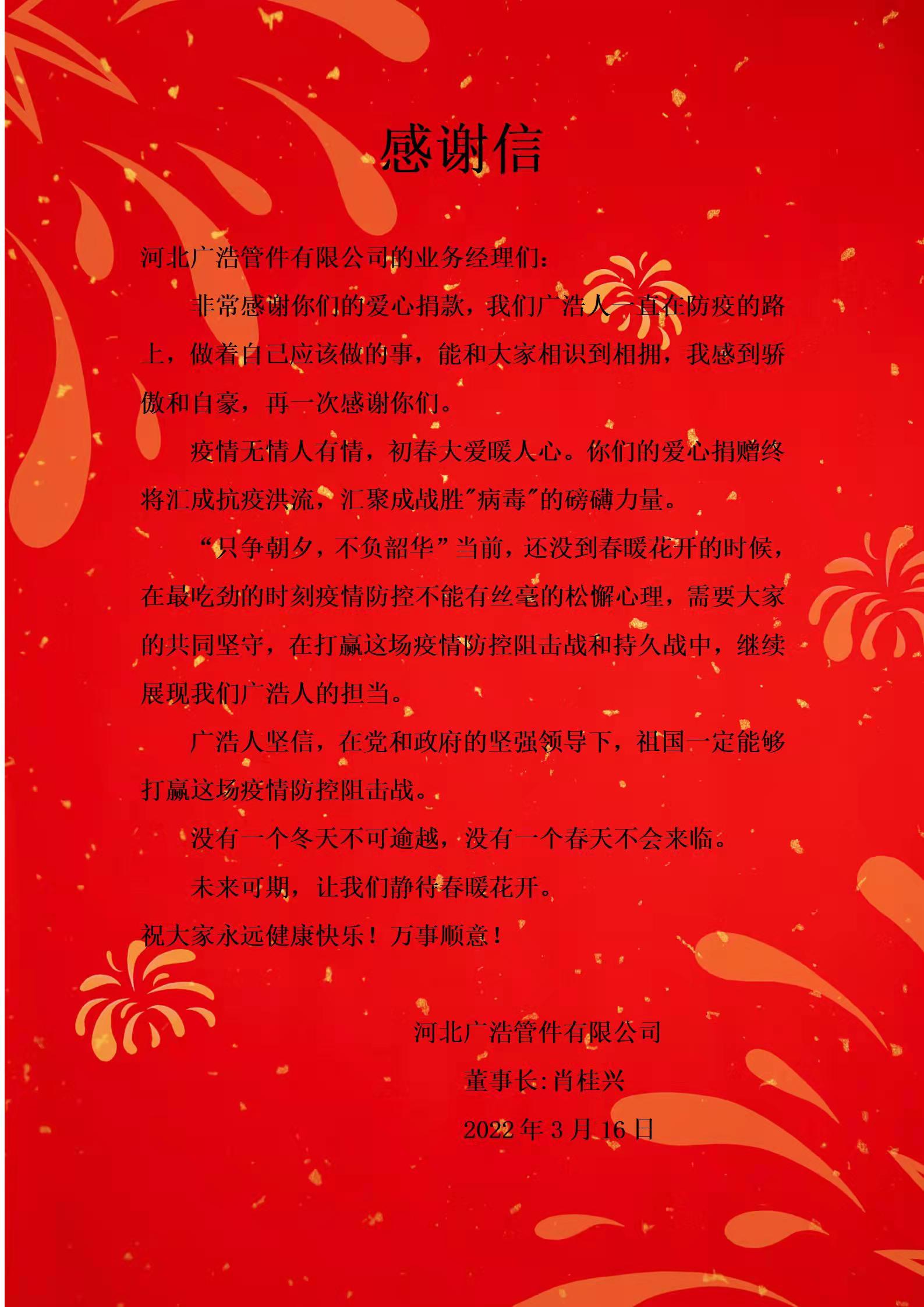 抗瘟疫广浩聚力,献爱心众志成城,保家邦赠于玫瑰,愿狮城重振雄风。当前,正处于本地疫情攻坚战的关键时刻,3月16日,半岛BD体育官网在线观看 向孟村县红十字会捐款30万元,用于疫情防控物资的采购。同时,董事长肖桂兴号召公司广大员工踊跃捐款,截止到3月16日上午,公司共收到员工捐款10.9万元。