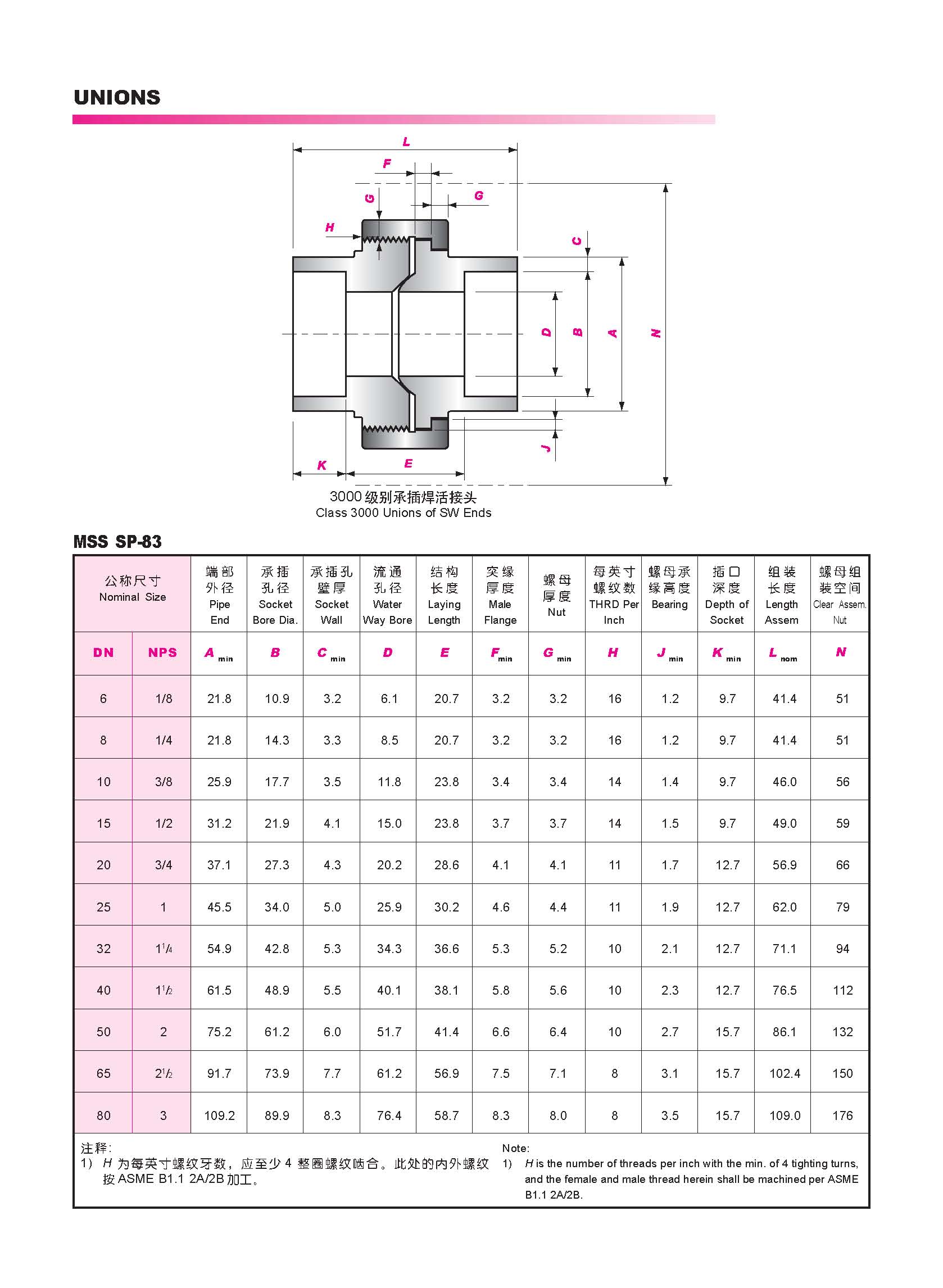 MSS SP-83 CLASS3000螺纹活接头的尺寸表