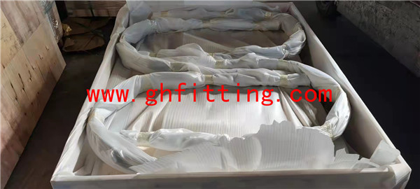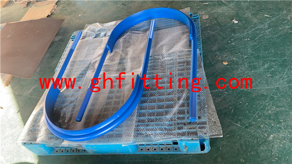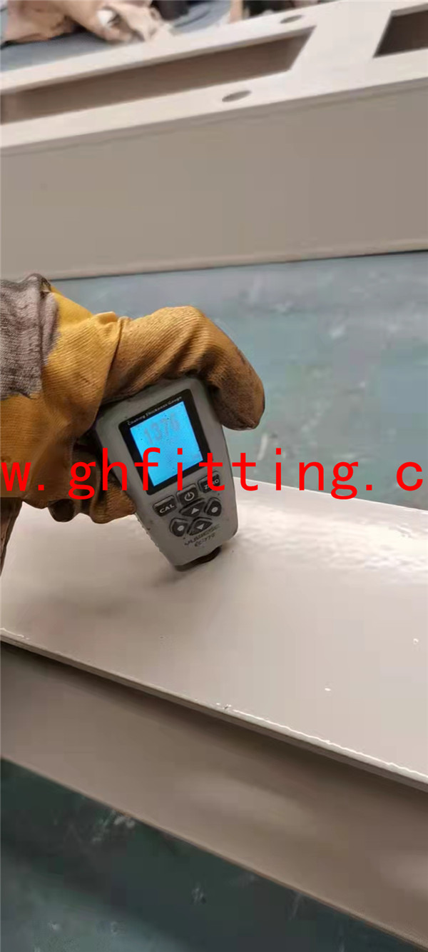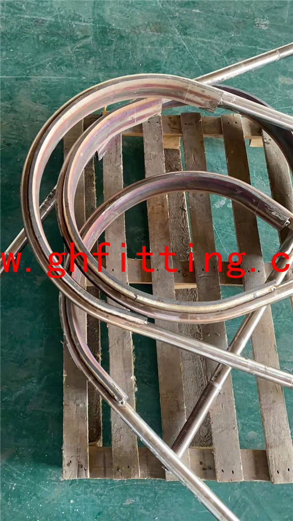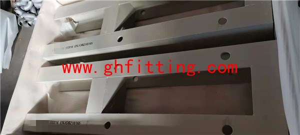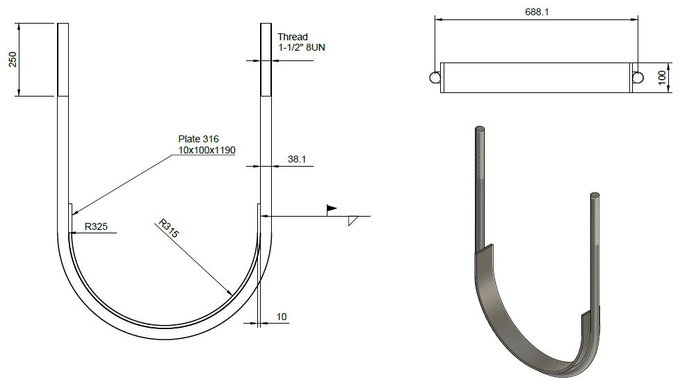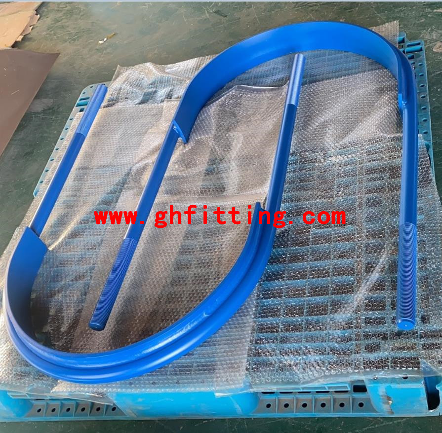 2.不锈钢管夹:螺纹尺寸为美制1-1/2"-8UN, 材质为ASTM A193 GR.B8M。下料为直径38.1mm的316材质不锈钢圆钢。圆钢折成U型螺栓后,内部焊接长度1190mm、厚度10mm、宽度100mm的不锈钢板,该不锈钢管夹用于直径630mm的不锈钢管道。成型后喷涂特氟龙涂层。