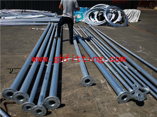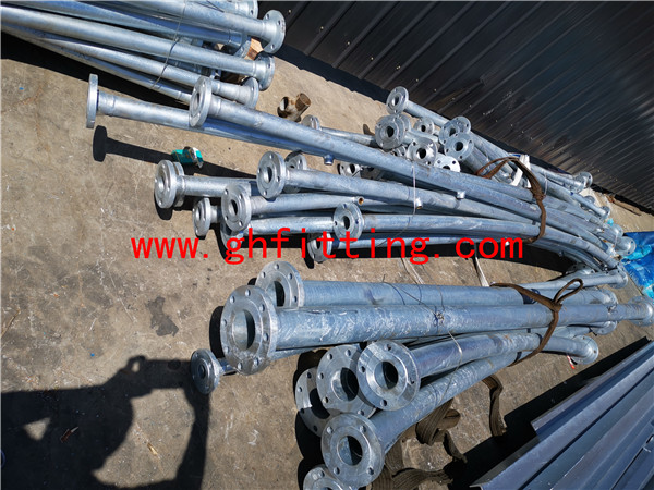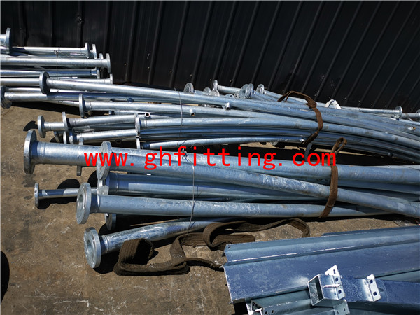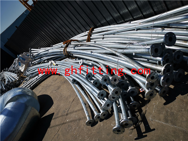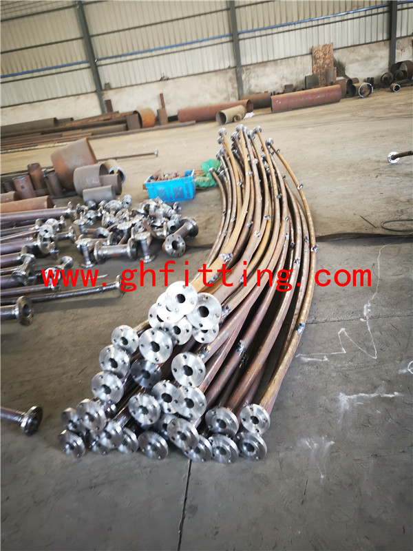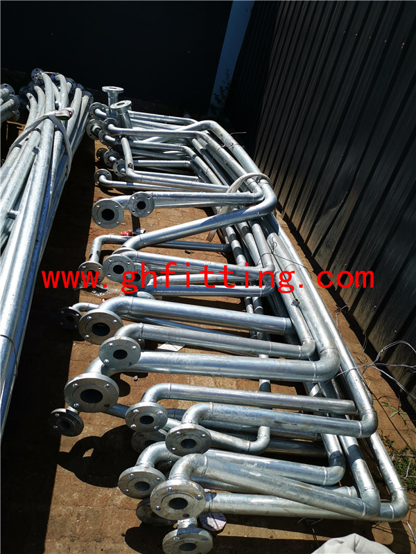 该配管项目为国外项目, 按客户提供的图纸加工。天然气球罐消防喷淋系统采用DN15-DN100、壁厚为SCH40的A106B无缝钢管,折弯形成不同尺寸的大半径弯管、开孔焊接螺纹支管台,两端焊接带颈对焊法兰后整体热镀锌,在镀锌加工过程中尤其要保护好螺纹支管台的螺纹部分。还有一部分配管部件需要将弯管、三通、弯头或者直管焊接。